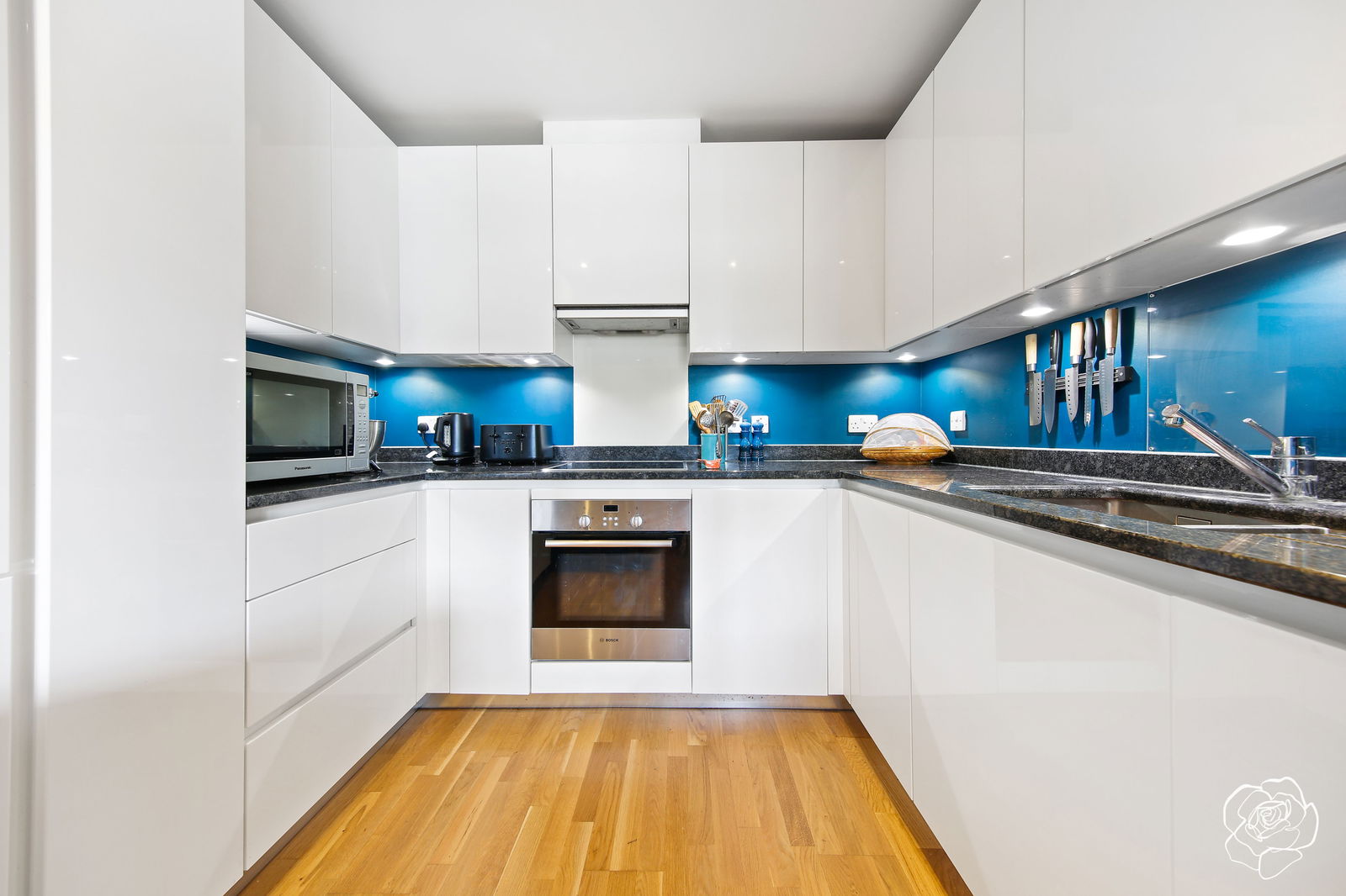 Facing the South East, this colourful property gets it's fair share of natural light; and with a balcony overlooking the raised courtyard, you have the perfect balance of light and tranquillity. The C- shaped kitchen provides enough space to offer a pull out pantry, plus a carousel cupboard to maximise storage. "The flat features a well-designed kitchen area that feels integrated yet distinct, not just tucked away at the back of the living room, but part of an open-plan layout with good natural flow and separation." We have to agree with the owner there.