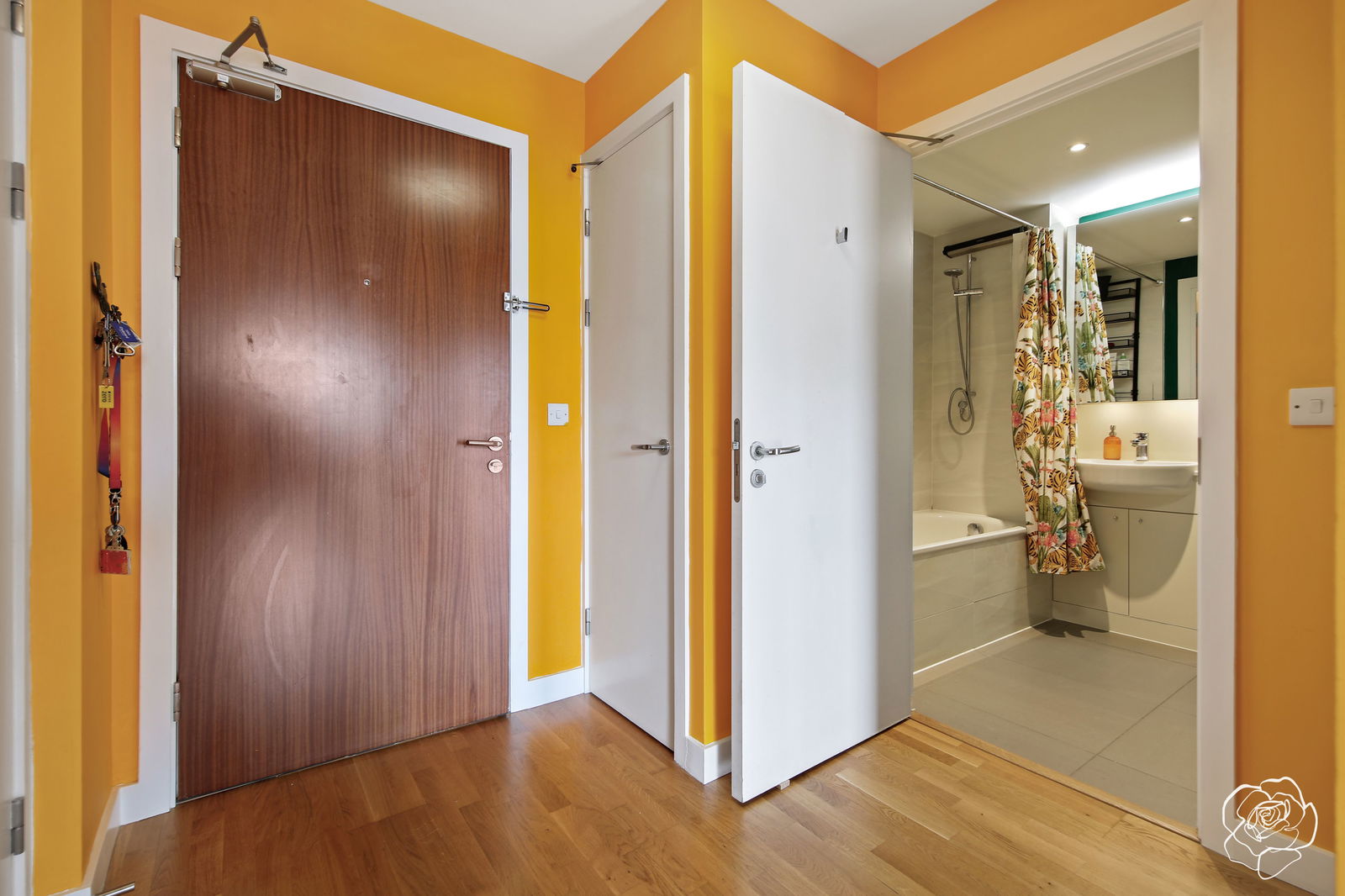 The generous bedroom has had carpet replaced with wooden flooring a year ago, and back into the multi exit lobby area - finished in Kernel of Truth Yellow - multiple storage options, and a three piece bathroom complete the tour.