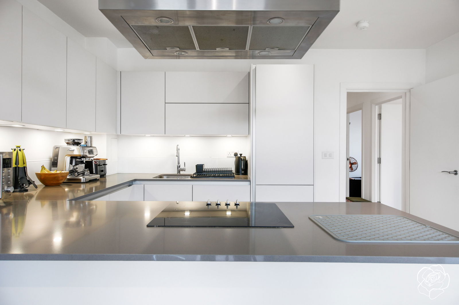 That's right. Carriage House' corner position affords it an abundance of natural light from both the North and East directions, with floor to ceiling windows also allowing afternoon sun from the West through all liveable spaces. Stepping inside from one of the balconies, the dual aspect, open plan living area has been designed to emphasize space and usability, where lounge space and dining space coexist and are clearly defined. A fully integrated c-shaped kitchen occupies one corner of the room and provides enough counter space for meal prepping, trying out new recipes, and entertaining.
