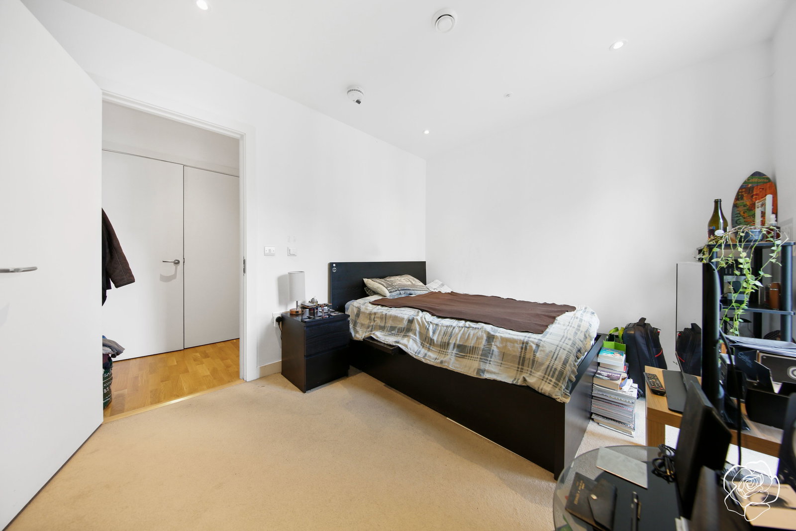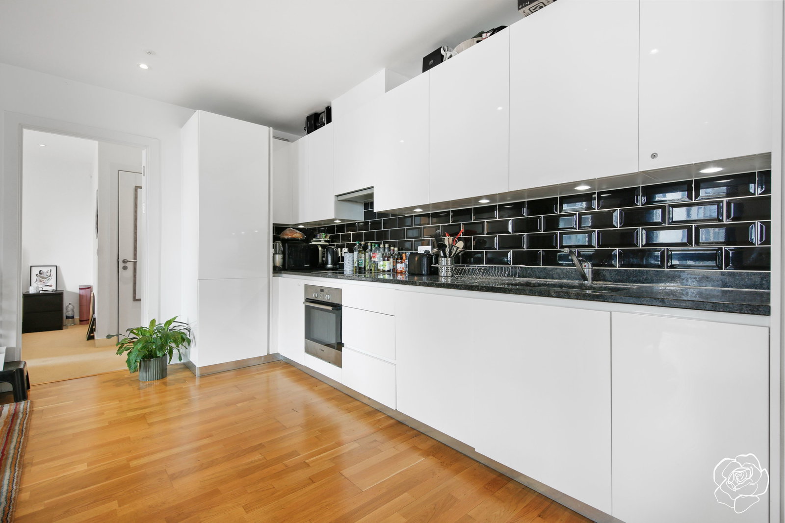 On the subject of layouts, both bedrooms border each side of the open plan living space, giving the flexibility to curate a guest bedroom, home office, or whatever takes your fancy - with both bedrooms serviced by bathrooms (one en suite), and a fitted wardrobe to the guest. The streamlined, integrated kitchen offers induction hobs plus a pull out pantry, and faces out onto a lengthy West facing balcony which is larger than most if you know the development well, and is also accessible from the premiere bedroom.