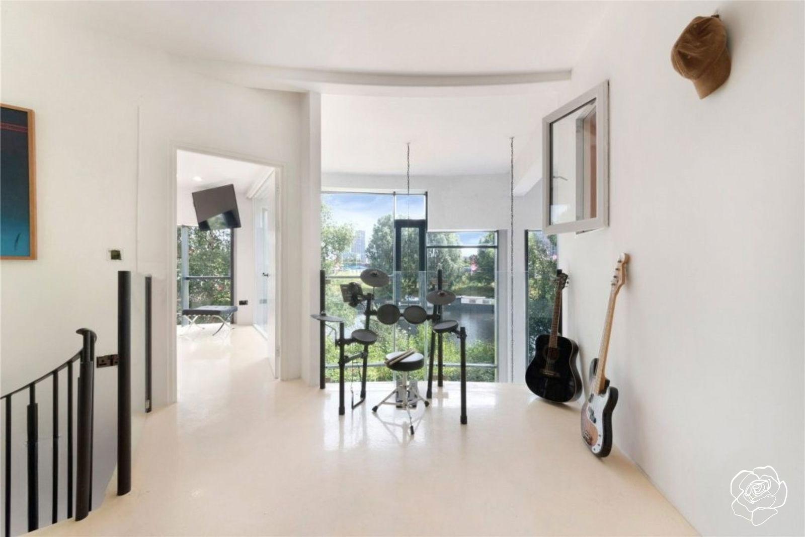 Everyday living and entertaining is the theme on the ground floor. To one side, a show-stopping kitchen island with integrated storage and breakfast bar, boasts sleek fitted cabinetry, premium Bosch and Miele appliances, and dual ovens. The open plan reception is the true centrepiece, with soaring double-height bookshelves and doors opening directly onto your own waterside terrace, allowing for additional modes of transport.