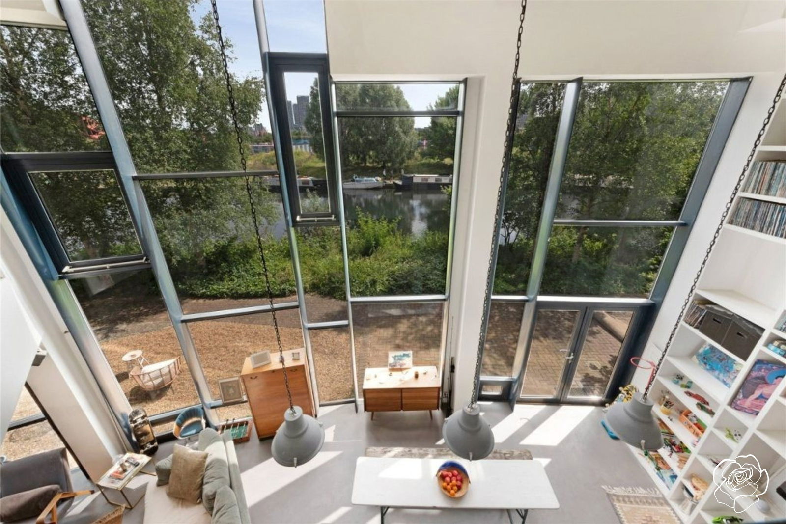 Upon entry, a six metre ceiling height of curved glass blurs the lines between the indoors and the outside in this modern oasis, boasting panoramic views over the River Lea, towards Hackney Bridge and beyond. The corner positioning of this near 1800sqft, three bed, two bath duplex draws an abundance of natural light from am East aspect, which floods the chic, modern warehouse aesthetic- a nod to the industrial heartbeat of Hackney Wick - and highlights polished concrete floors and statement design details throughout.