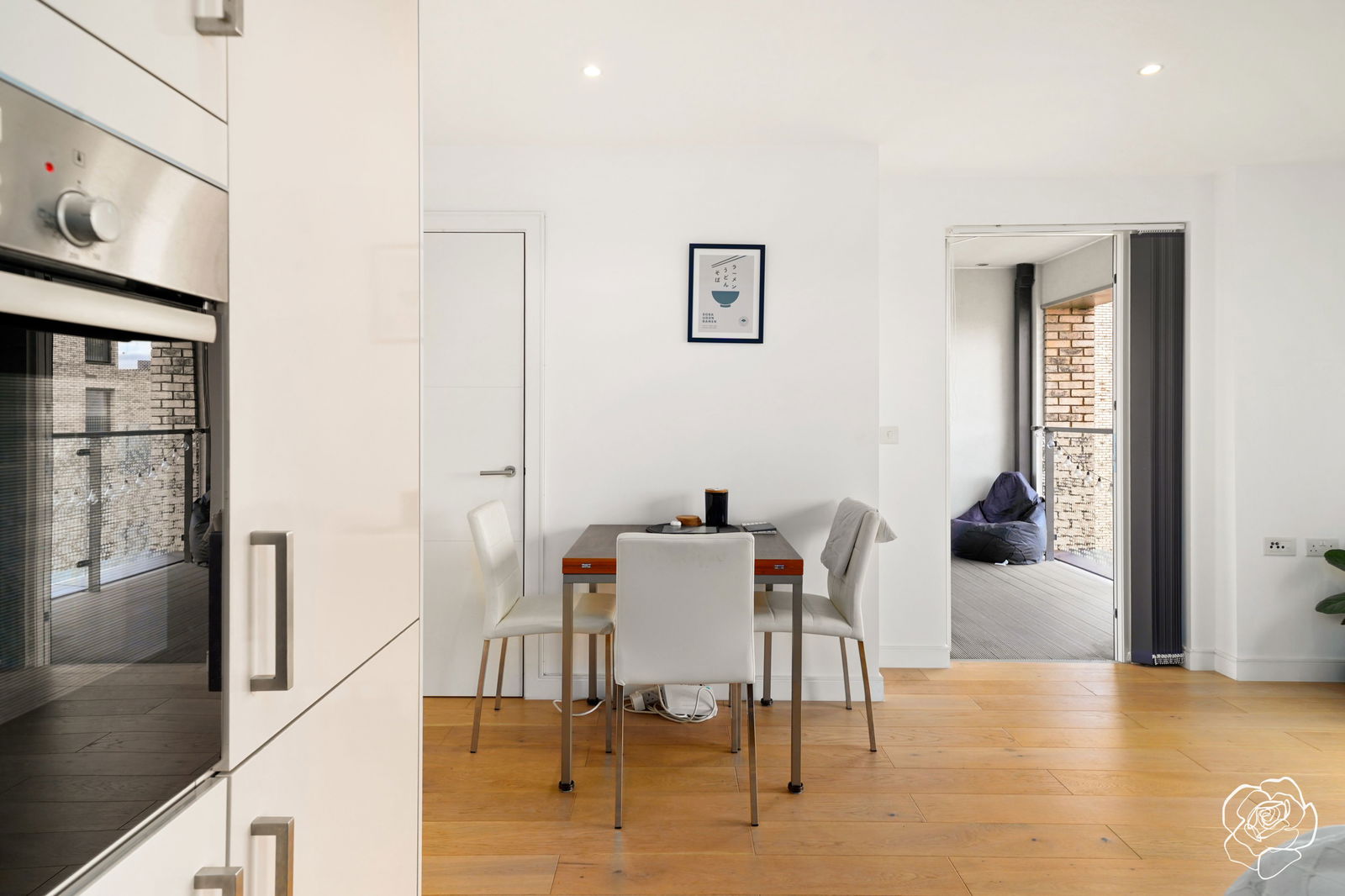 The well-proportioned balcony overlooks the courtyard and invites views of the Stratford Skyline, and can be accessed from either the reception or the bedroom, with the latter benefitting from a fitted wardrobe and black out blinds. A modern bathroom lies in parallel, with storage behind the mirrors, and more found in the surprisingly deceptive utility cupboard.