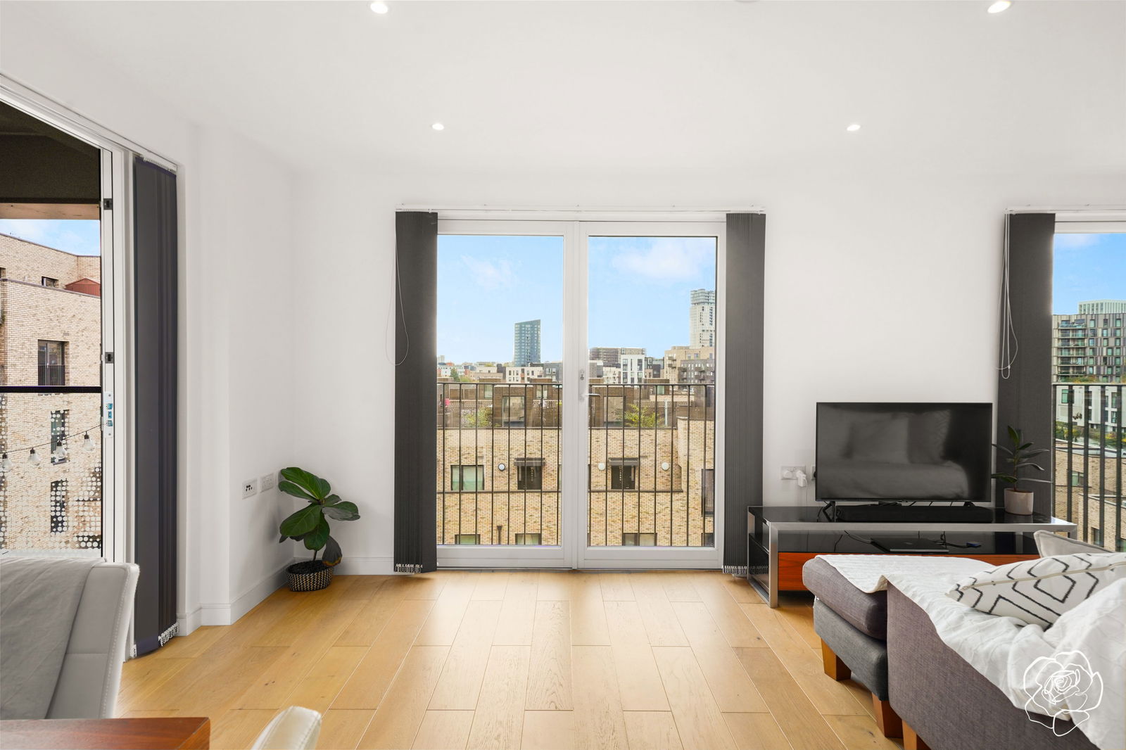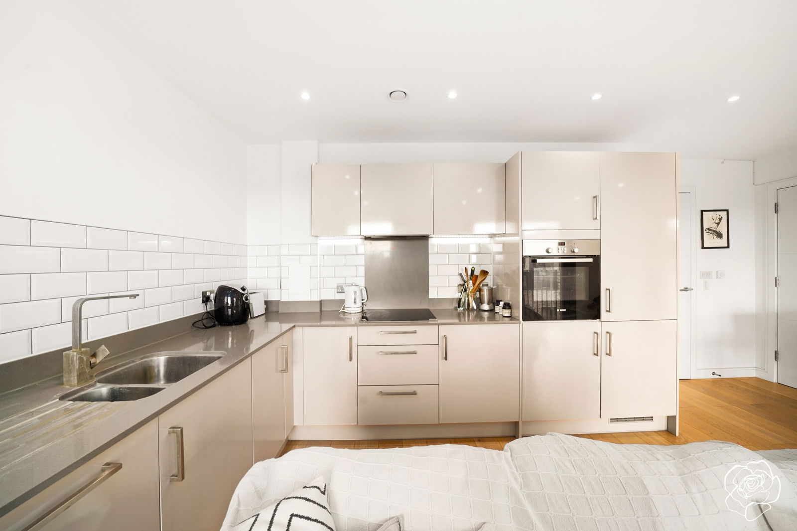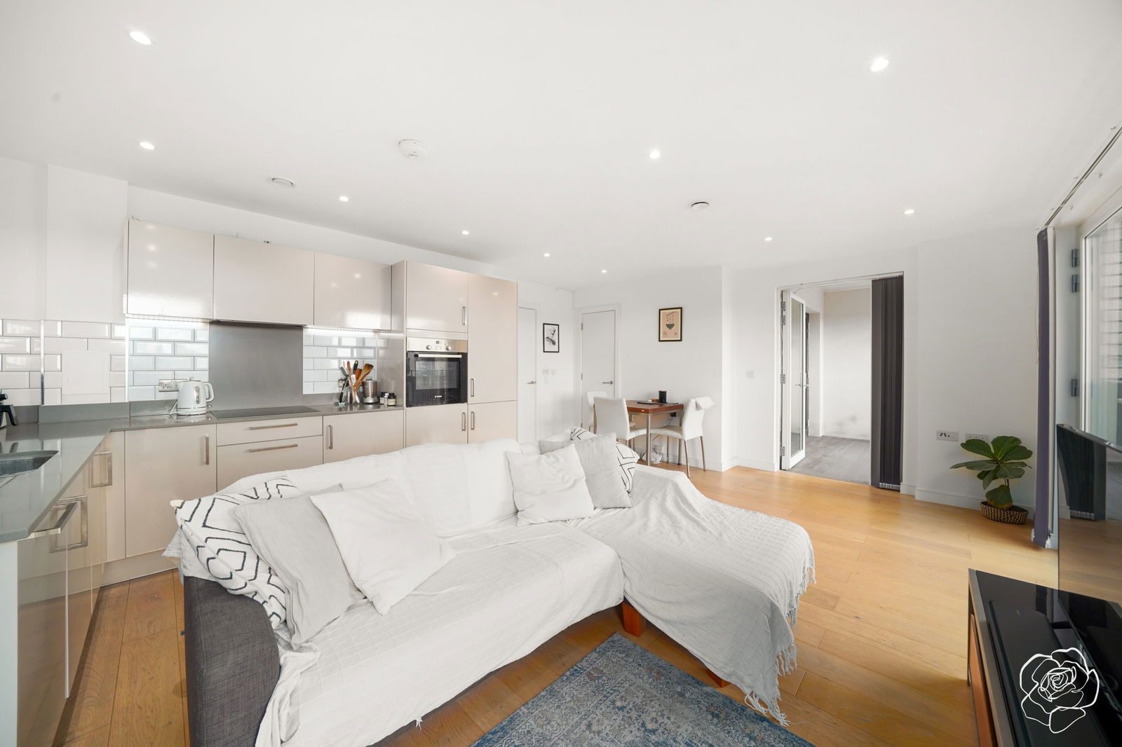 This South facing, fifth floor suntrap, boasts dual Juliette balconies that line the reception room and welcome sunlight throughout the day. In the same room, a sleek, fully integrated L- shaped kitchen with induction hobs, newly installed dishwasher and ample storage lies in wait. Couple with the Philips Hue lighting setup with variable underfloor heating and the colder months are sorted.