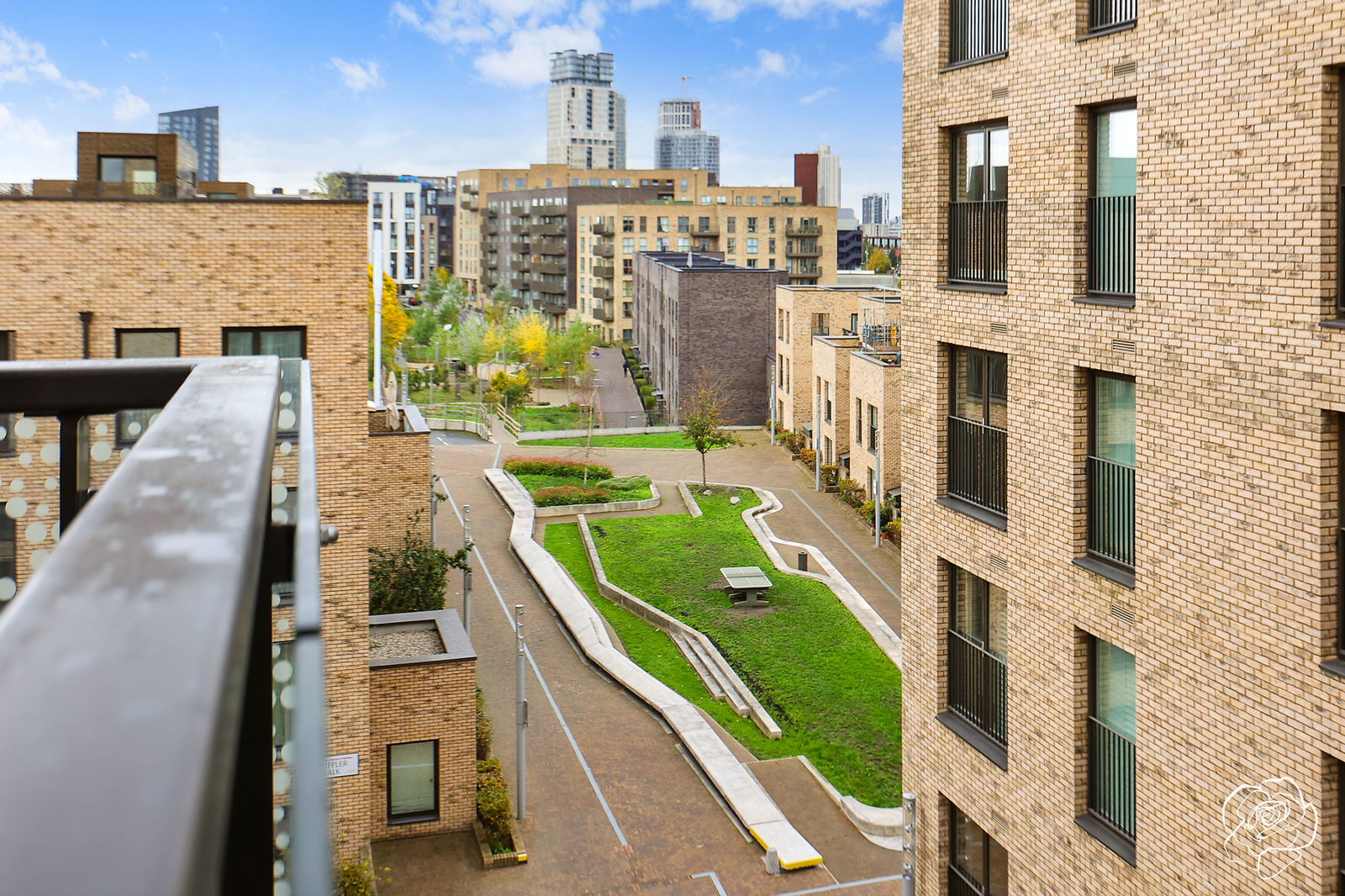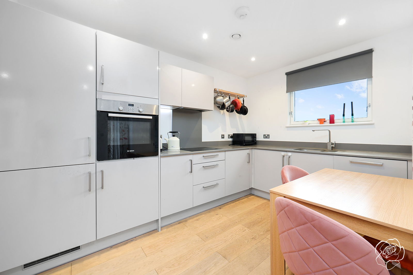 Spanning 587sqft from the 4th floor, one of our favourite features of this apartment is how much light it gets,- facing both the South and West directions due its' corner position, natural light is emphasized by plenty of windows throughout including a French door style window to the living space. Access to the balcony, which overlooks the private childrens' play area and further courtyard, is also granted from both the living area and L- shaped induction kitchen, allowing more opportunities for light and airflow. Two deep storage cupboards line one side of the living space, with a further two cupboards located in the hallway.