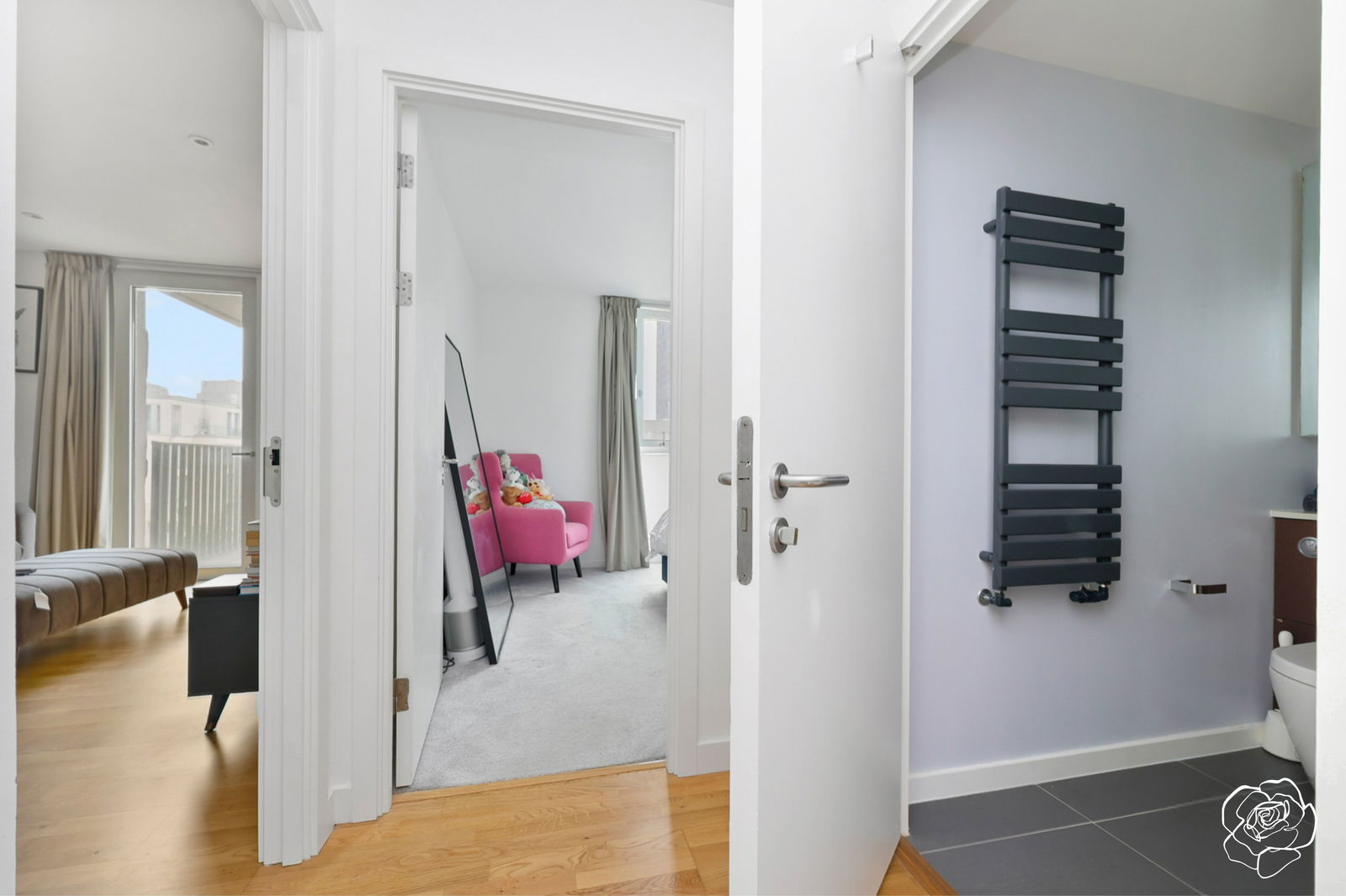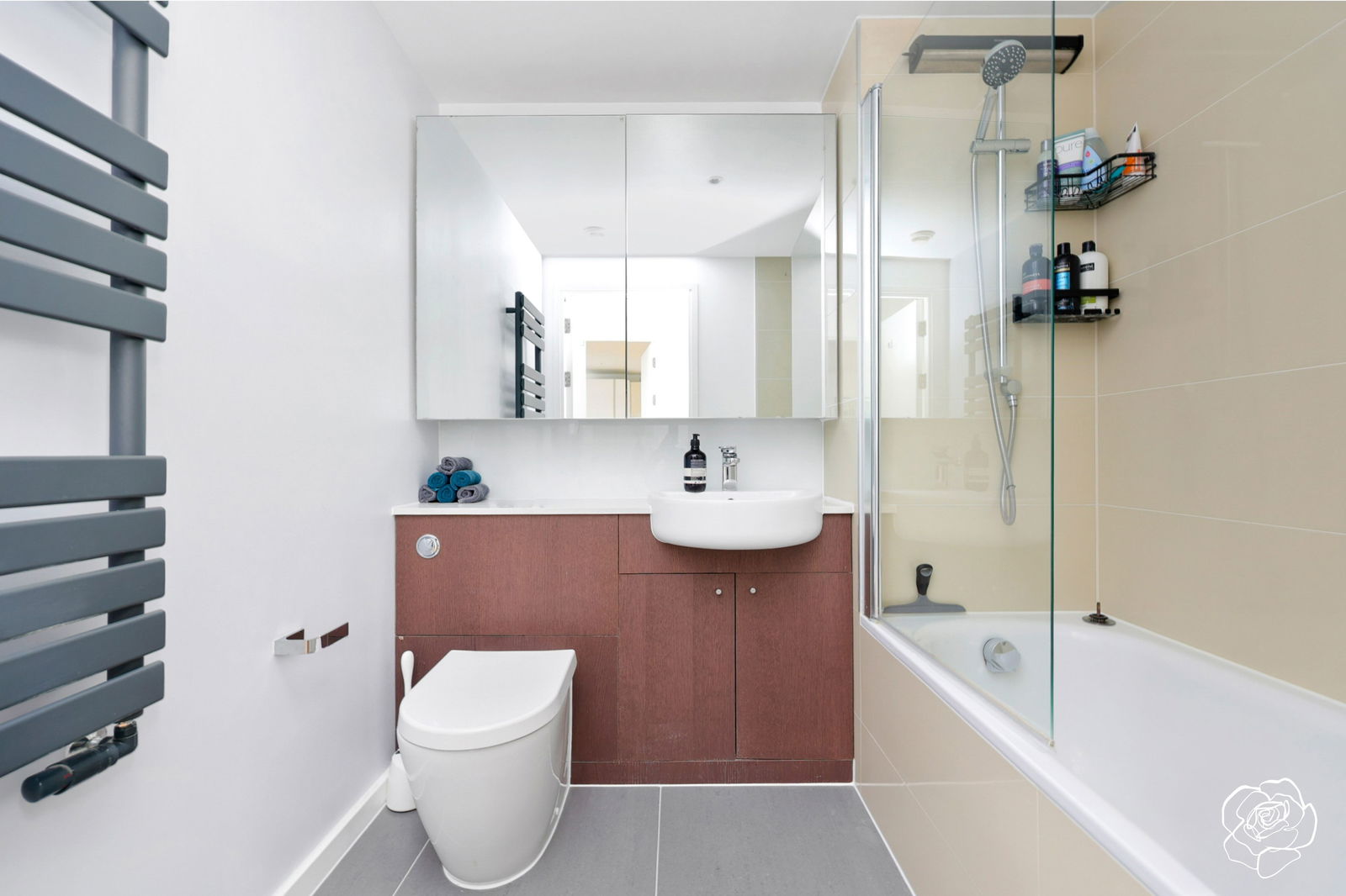 Zoned underfloor heating spans the 556 sqft floorplan and the bathroom, complete with storage behind the mirrors, benefits from a separately heated towel rail.
