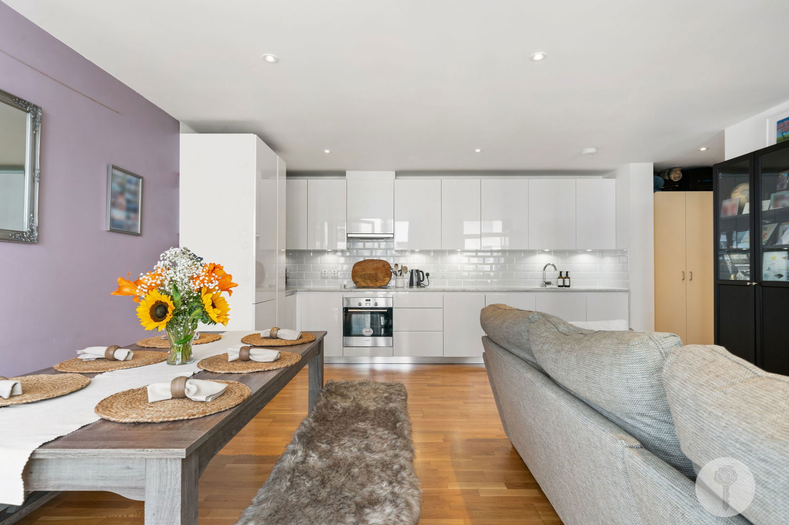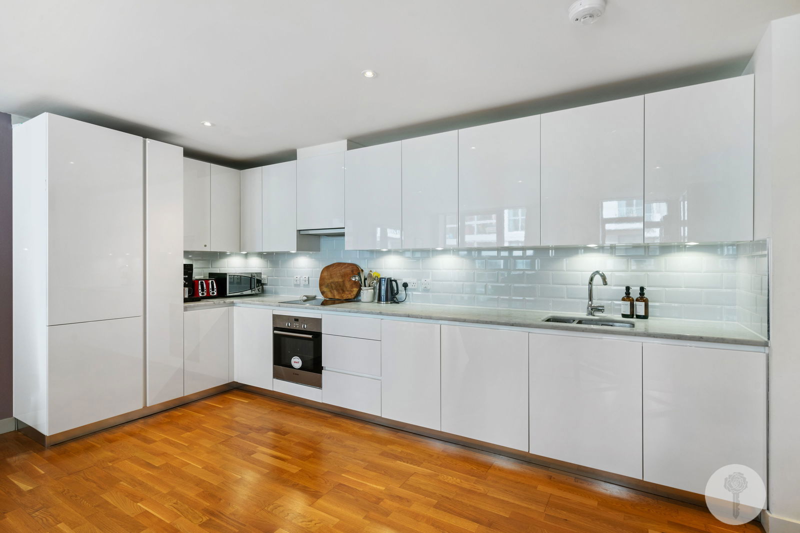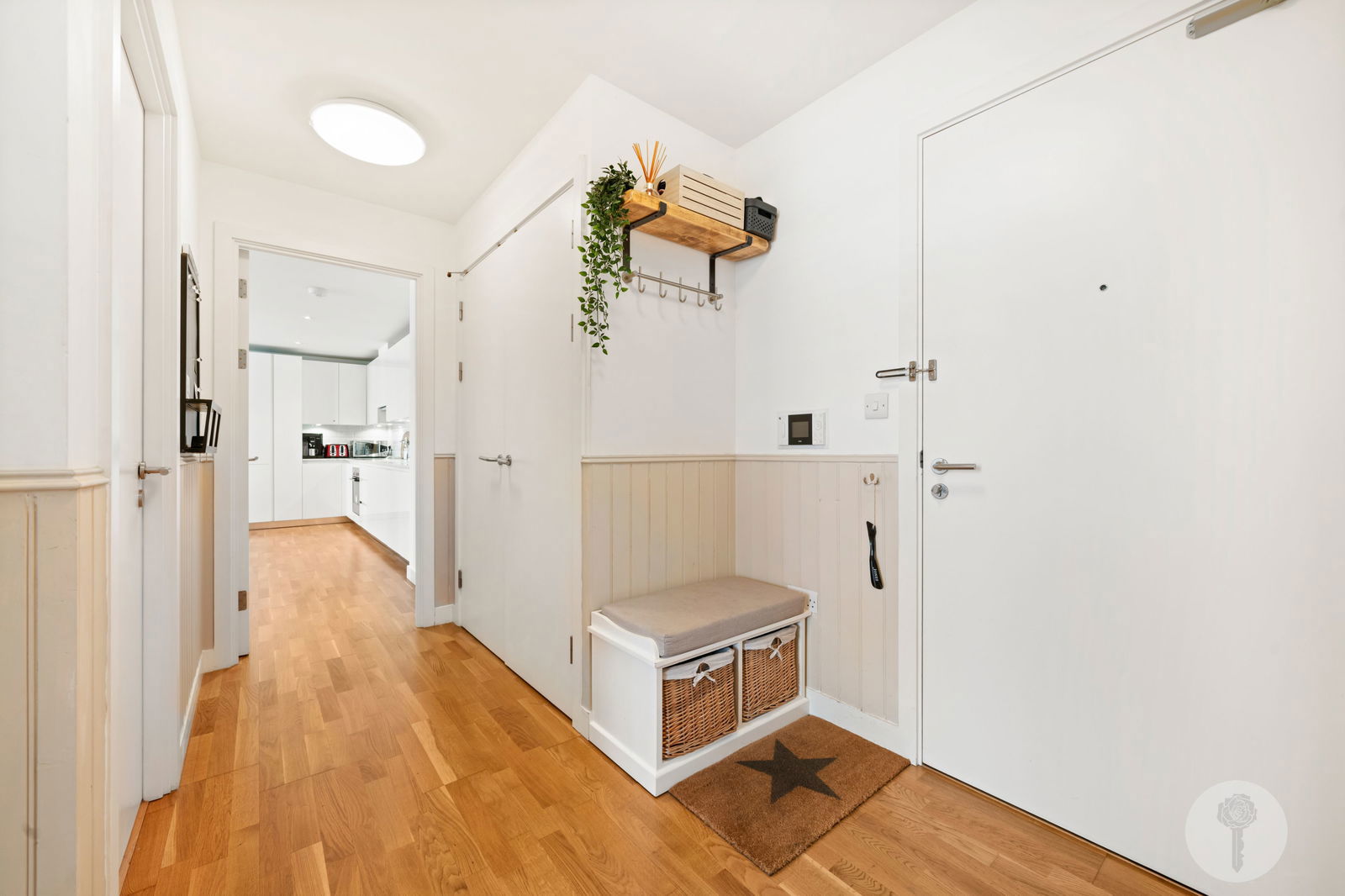 Stepping back in, a large, fully integrated, L- shaped kitchen with a tonal subway- tiled splashback stretches from the corner to the furthermost wall, providing plenty of storage including a pull out pantry. Panelling in Farrow and Ball's Estate Emulsion runs along the lengthy corridor, connecting more storage cupboards, two spacious double bedrooms and a guest bathroom, complete with mirrored cabinets, contrast tiling and a heated towel rail.