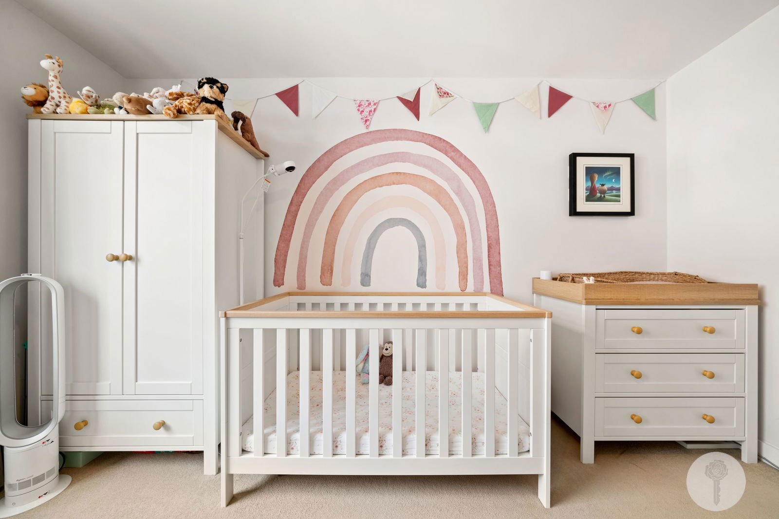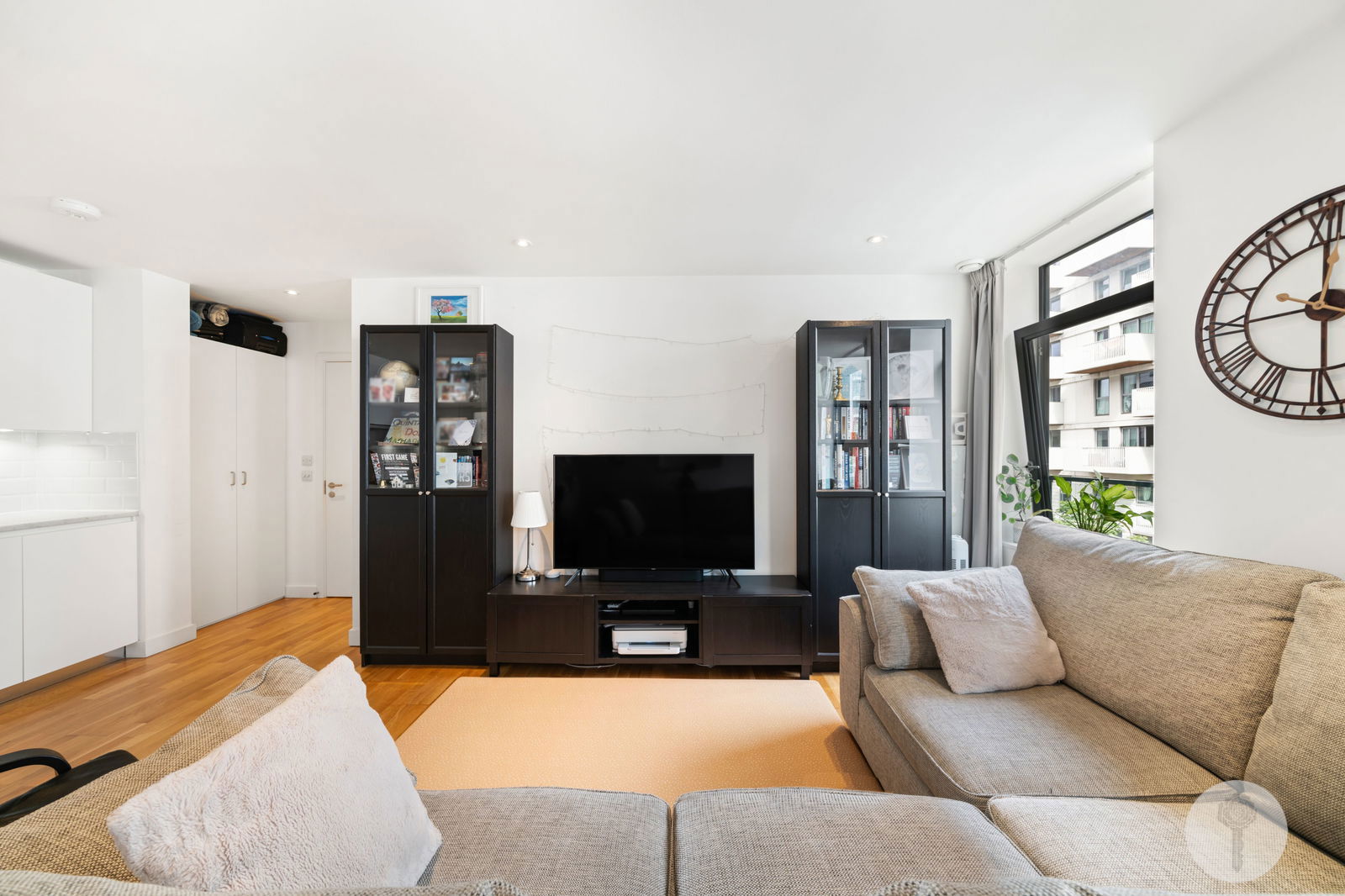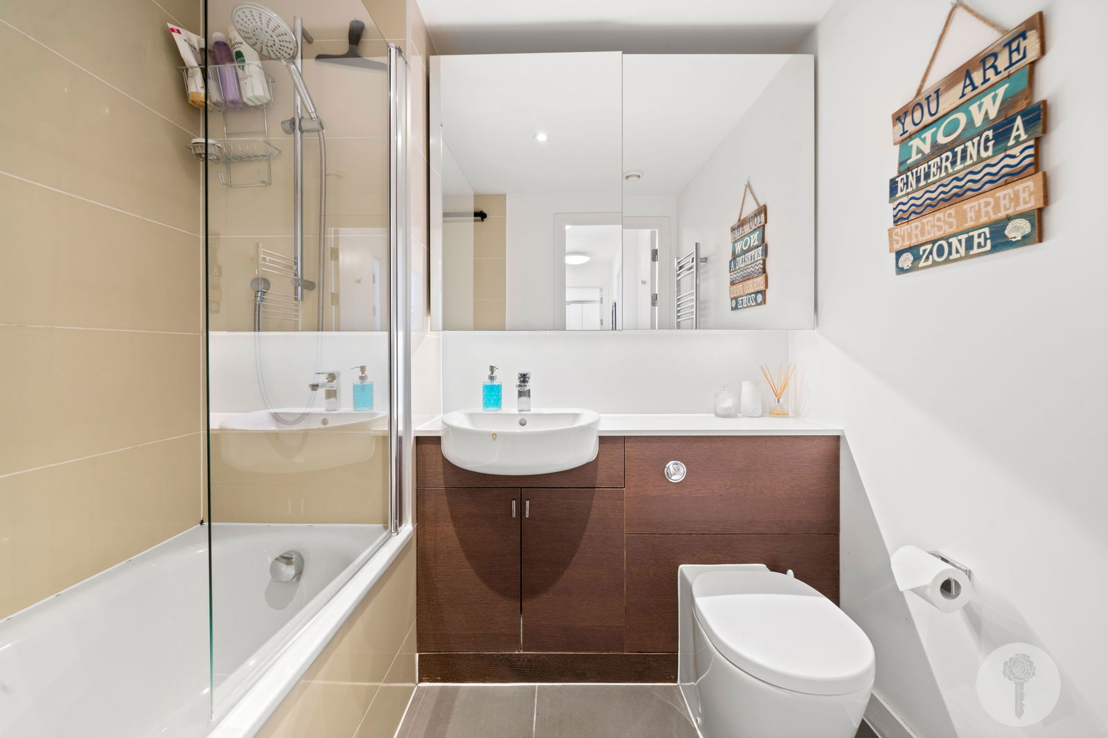 Stepping back in, a large, fully integrated, L- shaped kitchen with a tonal subway- tiled splashback stretches from the corner to the furthermost wall, providing plenty of storage including a pull out pantry. Panelling in Farrow and Ball's Estate Emulsion runs along the lengthy corridor, connecting more storage cupboards, two spacious double bedrooms and a guest bathroom, complete with mirrored cabinets, contrast tiling and a heated towel rail.