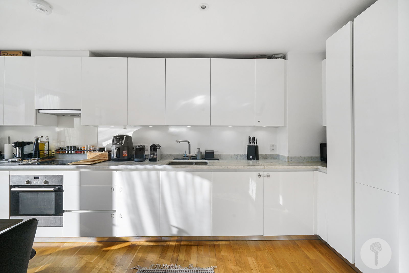 Stepping back in, a fully integrated L shaped kitchen provides plenty of storage and preparation space, running the full length of the generous open plan reception. A lengthy corridor separates living space from sleeping space, where three spacious bedrooms face East, alongside two bathrooms (one en suite), complete with storage behind the mirrors, contrast tiling and a heated towel rail. Zoned underfloor heating allows alternating options for different rooms.