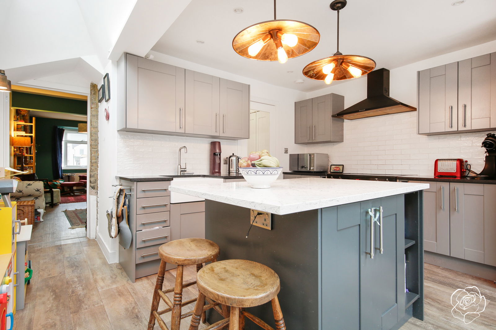 Newly fitted windows invite light in from the North, South and East, and the use of skylights in the unique, trapezium styled kitchen extension evoke a bright and atmospheric ambience. The kitchen island - set in quartz with a granite worktop - is the centrepiece of the extension, where conversations flow and laughter lingers. Subway tiles rub shoulders with a Belling induction range cooker and impressive storage options in the split L- shaped design, before passing through bi- folding doors into the lengthy, 32ft garden.