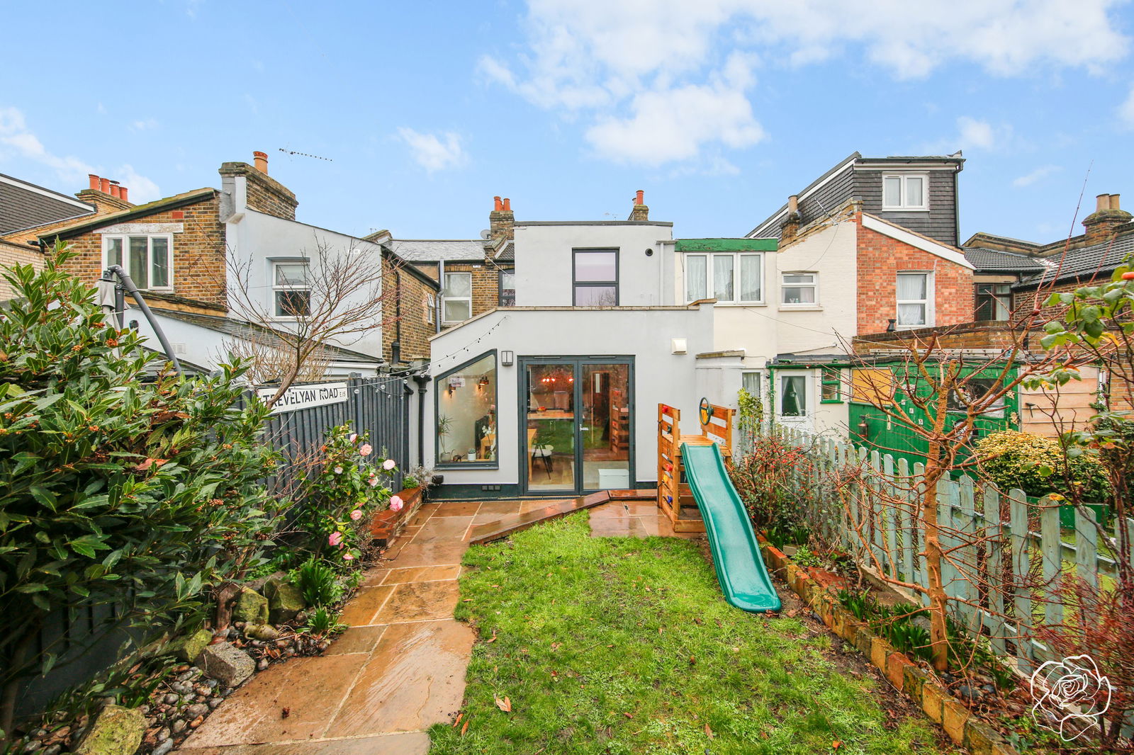 Renovated in the style of a modern family home, the double length reception room has two access points, which not only contribute to light flow, but also the general flow of the downstairs layout, as the kitchen can also be accessed from two different points. Lighting styles sets the tone throughout, and laminate flooring is traded for carpeted stairs, which continue up onto the landing. The largest of the three bedrooms offers fitted wardrobes running the length of both sides, and, rather than being overlooked, bathes in the natural light of the adjacent Idmiston Road.