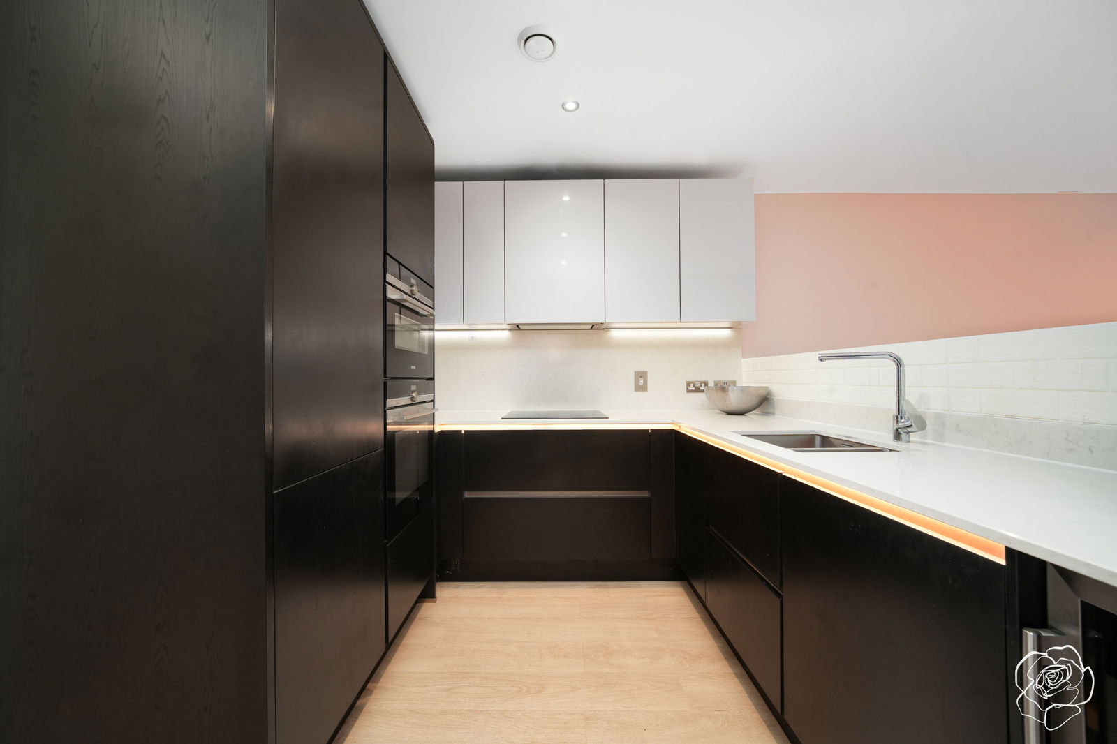 Upon entry, the corridor offers multiple storage cupboards and a custom built wall, creating a convenient place to remove shoes and coats. The impressive, remodelled U-shaped kitchen follows soon after, with an upgraded specification to include induction hobs, dual ovens and a wine cooler beneath the contrasting marble worktop and dark wood cabinetry, illuminated with recessed LED lighting.