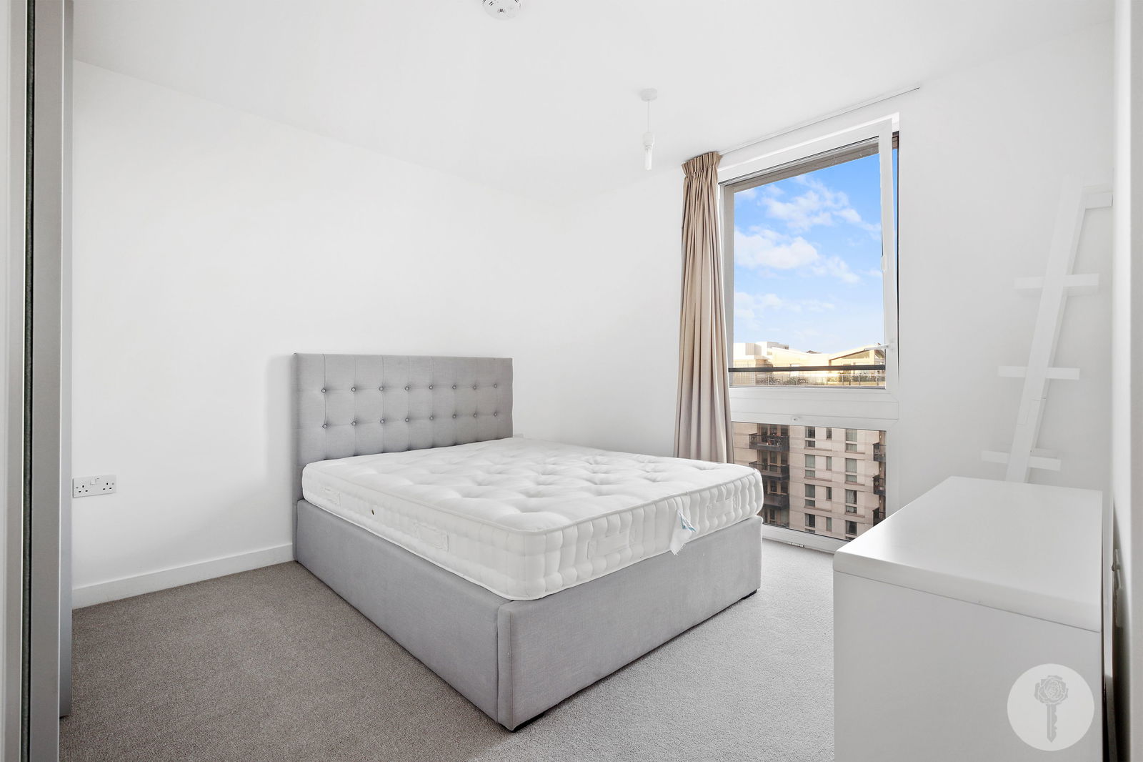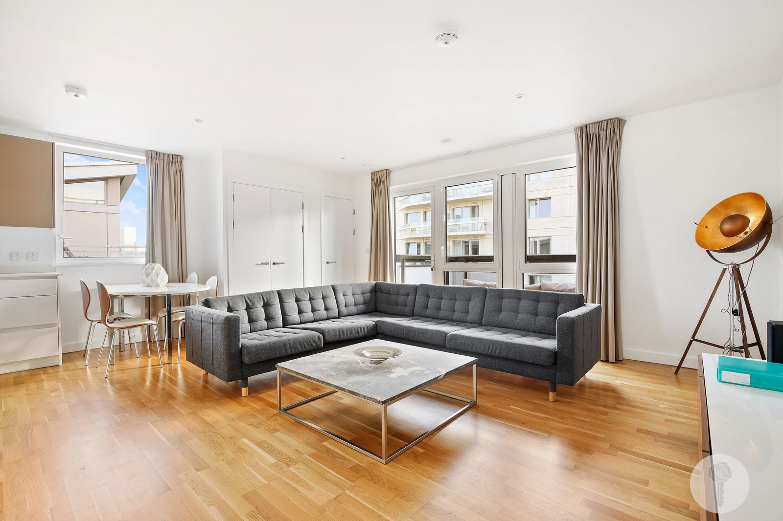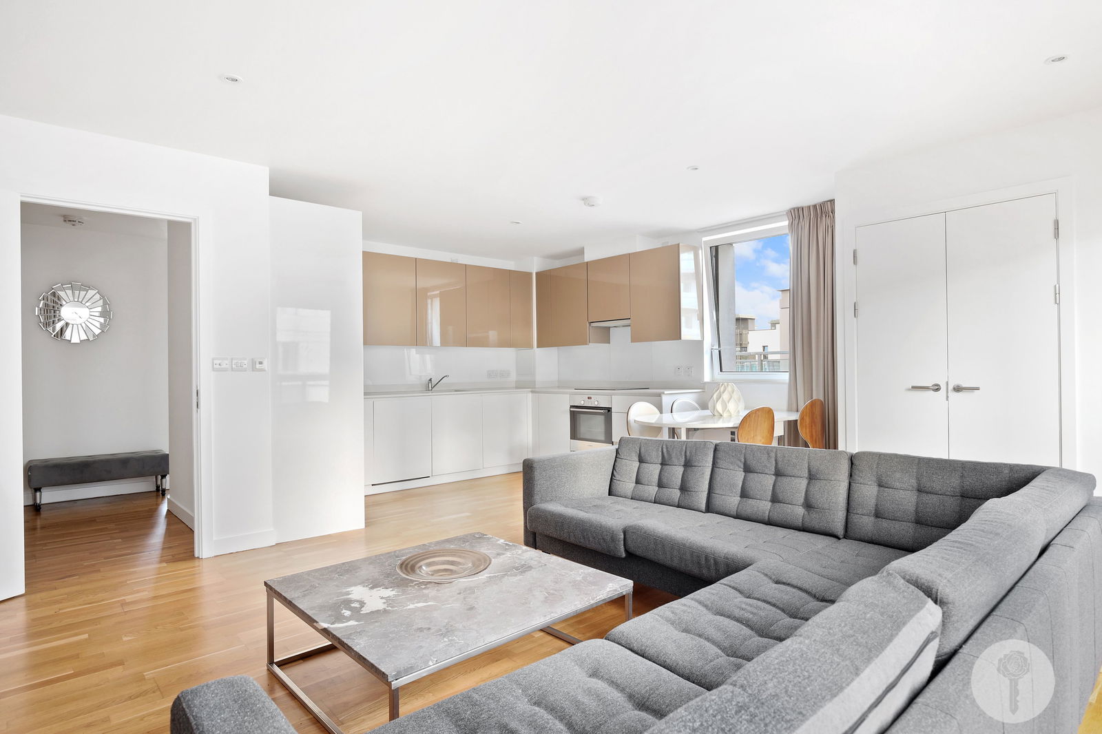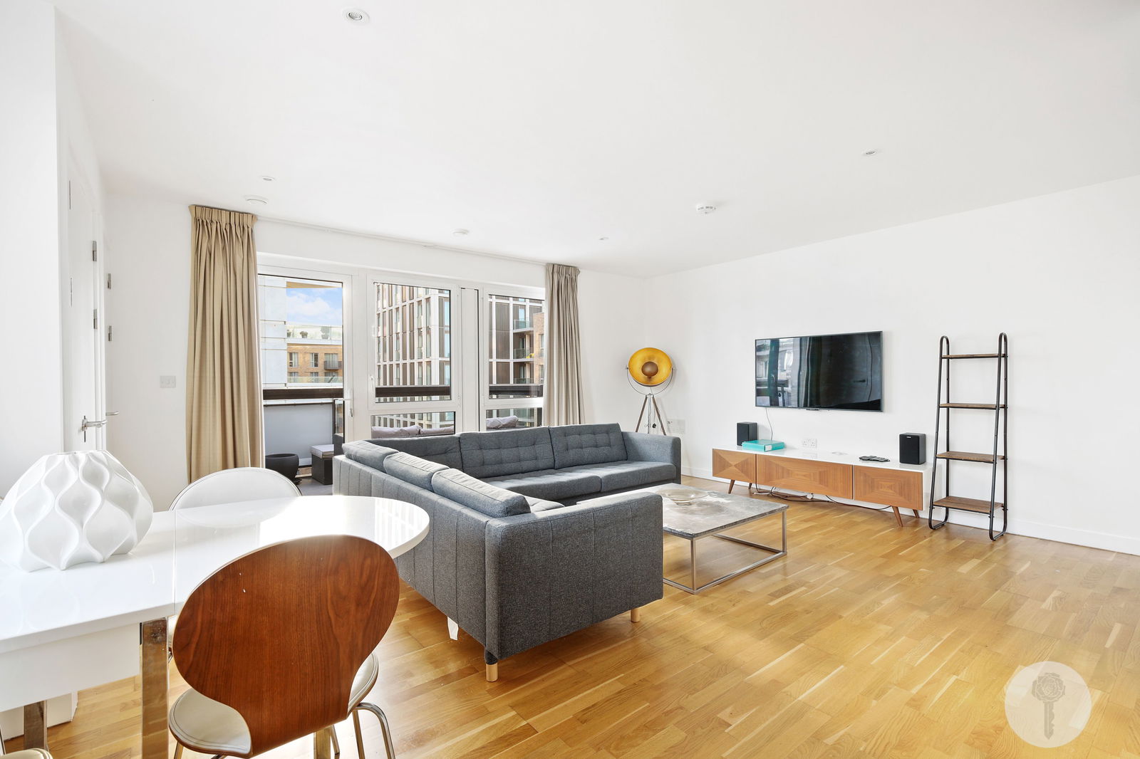 Perched atop the same building Team USA called home during the 2012 Olympic Games, Alexander Rose Estates presents a three bed two bath apartment boasting an open-plan design which seamlessly integrates the living, dining, and kitchen areas, creating a versatile space. Spanning over 1044 square foot of lateral living space, natural light brightens all rooms via full height windows throughout the day thanks to its triple aspect, offering views over the internal courtyard, the rooftops and further still, from the SW facing balcony.