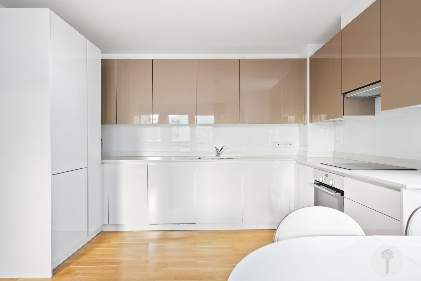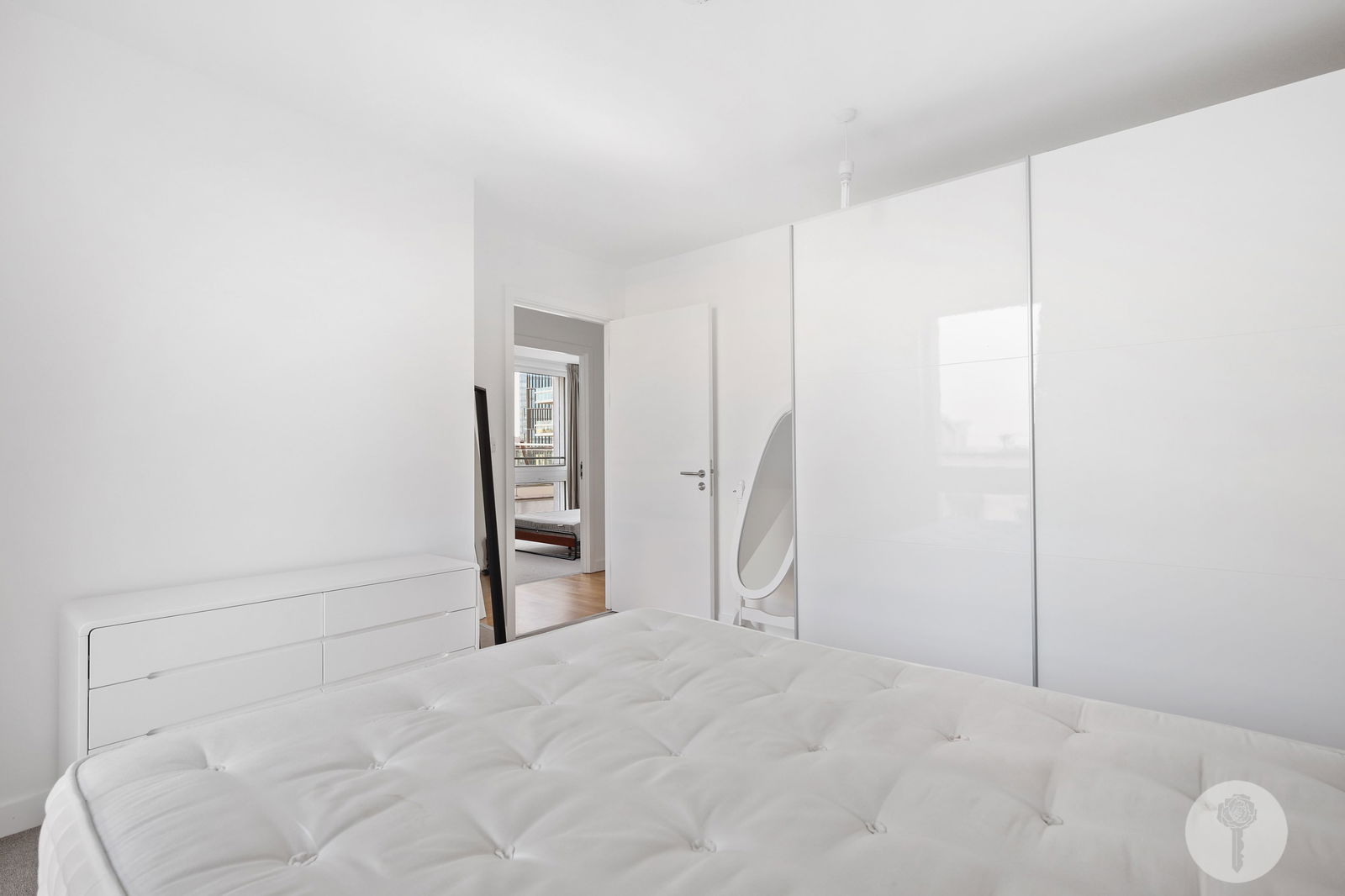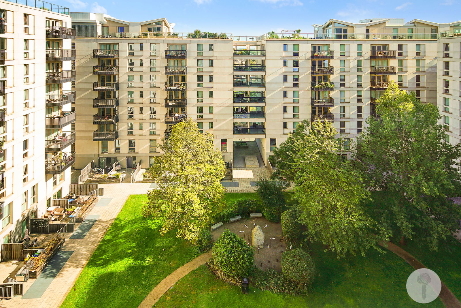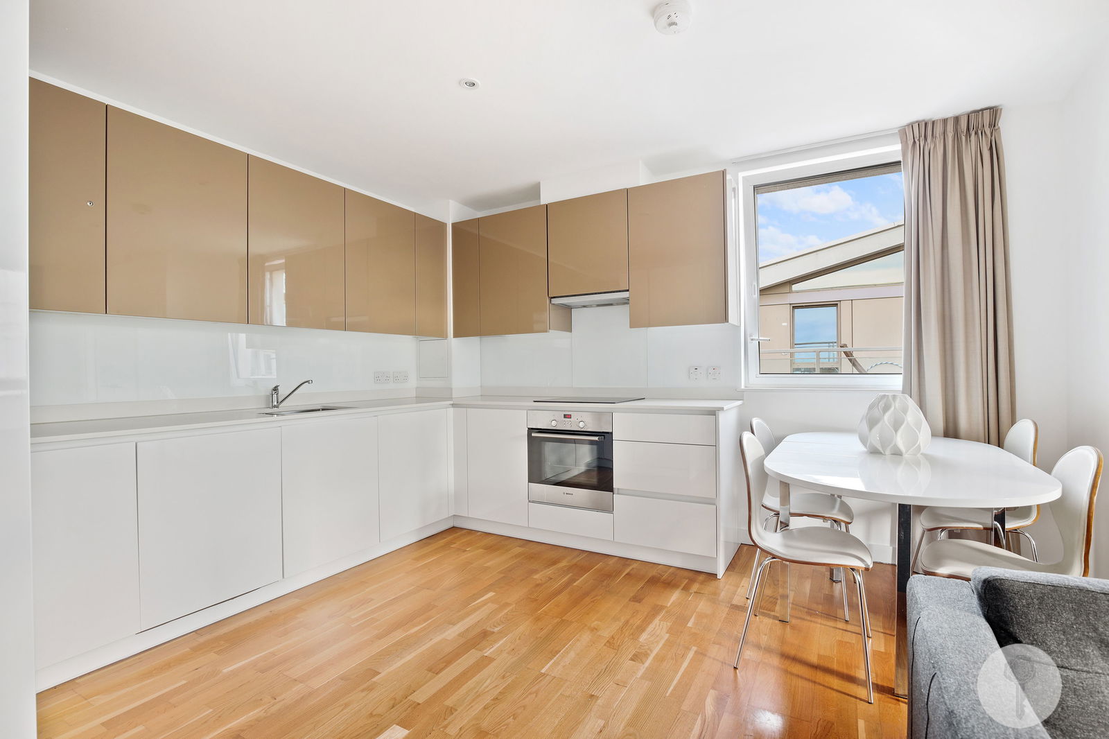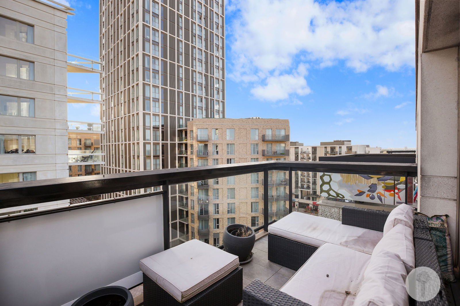 Perched atop the same building Team USA called home during the 2012 Olympic Games, Alexander Rose Estates presents a three bed two bath apartment boasting an open-plan design which seamlessly integrates the living, dining, and kitchen areas, creating a versatile space. Spanning over 1044 square foot of lateral living space, natural light brightens all rooms via full height windows throughout the day thanks to its triple aspect, offering views over the internal courtyard, the rooftops and further still, from the SW facing balcony.