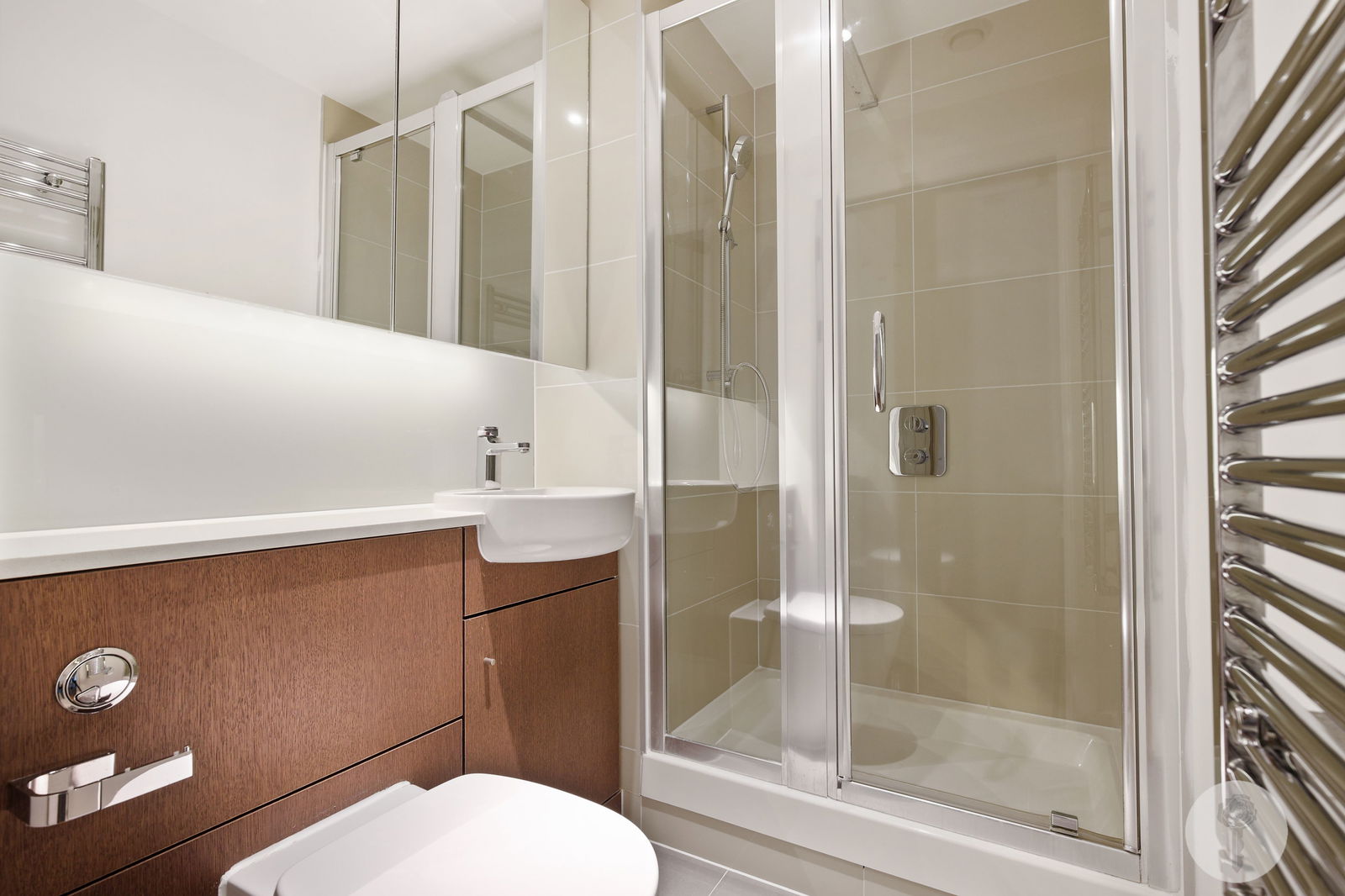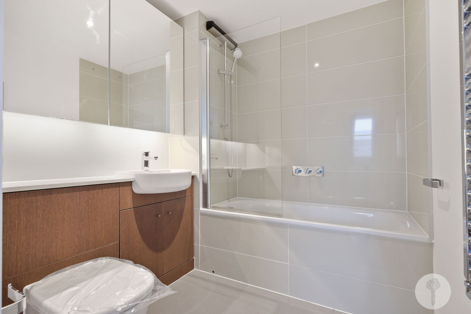 A fully integrated C- shaped kitchen with pull out pantry allows plenty of preparation space while also hiding some clever storage options. The three spacious bedrooms take up one half of the apartment, allowing undisturbed sleep if you’re the first to bed, with zoned underfloor heating allowing interchangeable temperatures across the liveable rooms. Both bathrooms come complete with mirrored cabinet storage, and separately heated towel rails.